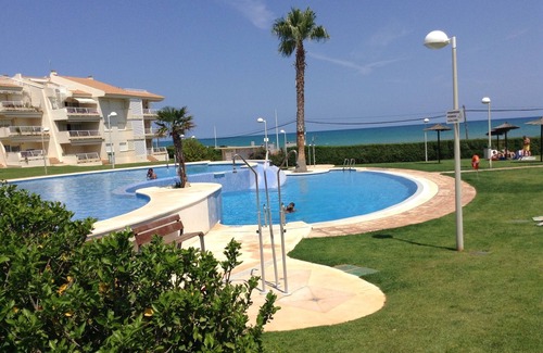 Privately owned luxury frontline apartment.New air-conditioning fitted 2022. Fully air conditioned, ground floor location with 2 bedrooms, 2 bathrooms, sleeping 6 .CASTELLON AIRPORT 20 mins . - Unspolt Spanish Resort, Very Good Value Inexpesnsive Restaurants, Beautiful Beaches, Marina And Golf There is a large sunny, south facing patio overlooking pool, beach and sea. Safe gated complex in large beautifully landscaped gardens facing sandy blue flag beach. Own parking space. There are restaurants and well a stocked supermarket 2 mins walk away. The small unspoilt resort, alcossebre is a 15 min walk with marina, golf tennis, watersports etc. Peniscola is a 20 mins drive. Morella is 1 hour’s drive. There is a water park in 30 mins drive and port adventura theme park is 1 hour’s drive.