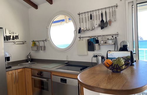 The apartment includes a living room of 50 m2 with an American kitchen, bathed in light. It opens with bay windows on a 40 m2 terrace, fitted with roller blinds so shaded according to your needs. Ideal space to take your meals and sunbathing facing the sea. Absolute calm, only the rustling of the waves in the background.