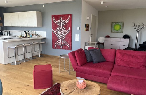 Chic, bright dream apartment with 3 bedrooms, open kitchen and two modern bathrooms. In the residential area of Durlach, a suburb of Karlsruhe, you are surrounded by trees and vineyards and a fantastic view over Karlsruhe and into the Rhine plain. You feel like you're living in a treehouse! Enjoy your sundowner on the great terrace, sunset guaranteed.
