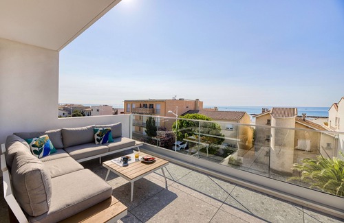 The terrace of this Duplex apartment of 110 m2 is exceptional. The composite glass railings will provide you with an exceptional view on the sea.