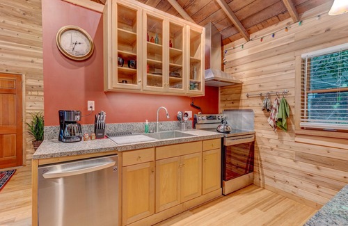 This wooden cabin has a vaulted wooden ceiling and bamboo floors. Camp Creek flows past the deck to the Siuslaw River. Beautiful tranquil forest vistas are there to inspire you to write your novel. Inside amenities are brand new, including Wi-Fi, dishwasher, oven, washer and dryer, microwave, wall-mounted swivel TV, and a ductless heat pump. A spacious bathroom has a glass shower, toilet, and vanity basin with large mirrors. There is a beautiful cedar deck with a gas BBQ, railing, and two gates. The gates open onto the lawn and to Camp Creek where you can select your own pebbles for rock painting on the deck or inside the cabin while relaxing with coffee, tea, beer or wine.