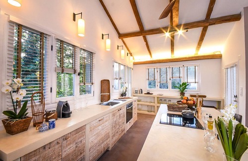The property has its own entrance with a private gate. Nice garden with 2 separated terraces and a summer kitchen for 10 persons, equipped with 6 burners gaz BBQ, fridge and sink. Nice size swimming pool with 8 lounges chairs. Big entertainment area inside, separate in 2 levels. Dining room with French door opening on the terrace by the pool. And an American kitchen fully equipped and dining area with its own terrace and outdoor stairs to access the garden and the pool. 4 double bedrooms and a separate study with a sofa bed. 3 bathrooms and a powder room.