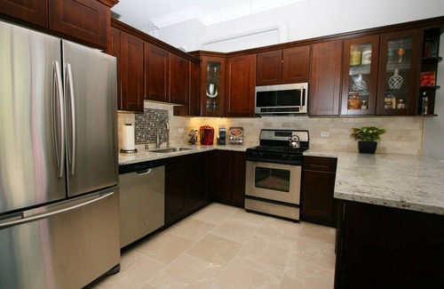 o Modern full size kitchen with granite counter tops and major appliances.