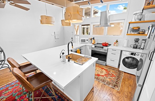 All new (2023) appliances include induction range & Bosch dishwasher. You’ll have plenty of options for tea & coffee: there’s a French press, coffee bean grinder, and drip option. Thoughtfully appointed with olive oil, spices (skinny storage area - pull open to L of oven), Mepal storage containers, Kitchenaid mixer, glass baking dishes, baking sheets, mixing bowls, crock pot, pots & pans. Dishes are handmade pottery from Bozeman, MT artisan and are dishwasher & microwave safe! Washer & dryer are under counter in kitchen and laundry soap is provided.