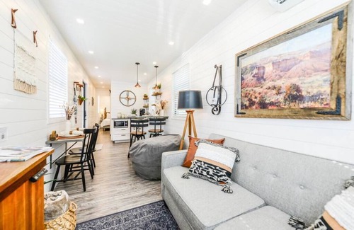 This cozy home is constructed from a 40' shipping container. With 1 bedroom and one bath along with a bean bag floor mattress this home can sleep up to 4 people. Get a good nights rest in the super comfy Tuft and Needle queen size mattress. Equipped with a kitchenette with a microwave, mini fridge and single burner cooktop. Step up to the upstairs balcony to unwind and watch the sunset from your own lounge chairs.