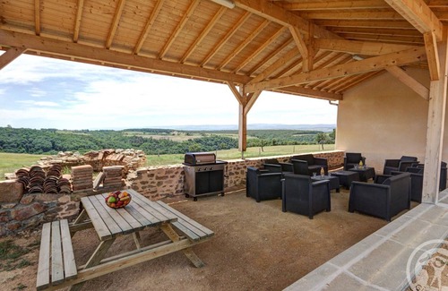 250 m² gîte with 4 bedrooms, kitchen, dining room, living room, living room with bay windows opening onto the countryside and its spa + sauna. For your comfort, 3 shower rooms, 1 bathroom, 3 toilets, heated floor, beds made on arrival, towels provided and included in the rental, 165 cm flat screen TV, bean-to-cup coffee maker (filled on arrival), American fridge... Roanne 20 min, St-Etienne 45 min, Lyon 1 hour, Clermont 1 hour 10 minutes. Access to the gîte via a 200 meter passable road. Possibility of subscribing to a cleaning package for an additional €120 (excluding cleaning of the oven and the plancha). Detached house completely renovated in 2018, isolated and easily accessible, in the heart of the Gorges de la Loire, in an exceptional natural environment. You'll appreciate the peace and quiet, the panoramic view, the high-quality interior fittings, the 21 m² unheated above-ground swimming pool, the covered terrace, and the Loire River just a 10-minute walk away.