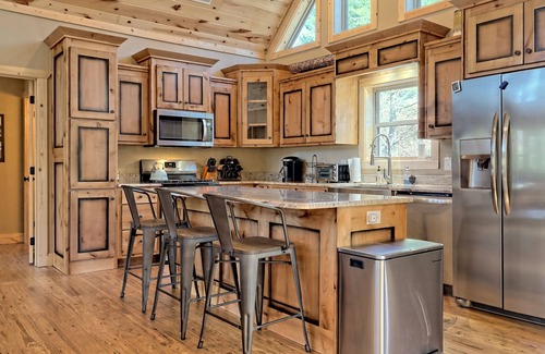 Nestled in the Blue Ridge Mountains, this beautiful, quiet chalet is the ideal spot for a peaceful retreat. This home is the perfect balance of rustic and modern with tons of natural light. Enjoy the natural tranquility with all the creature comforts you could want. Easily accessible on paved roads, this single level two-bedroom, two-bath home is less than a 2-hour drive from Atlanta, Asheville or Chattanooga. Located in Murphy, North Carolina between the Hiawassee River and Valley River, there is plenty to do in every season or just come to relax and take in the mountain views. Unwind in front of the cozy fireplace with a book or play a game on the arcade. The kitchen is well appointed with everything a chef could ask for. The master bedroom has a king-size bed, large walk in closet and en-suite bathroom with separate vanities and a large tiled shower. The second bedroom has a queen bed and the sofa in the den is a queen pull out bed. Both bedrooms have large televisions, plenty of storage and French doors that lead out to the deck. The outdoor space includes a large dining table, gas grill and foosball table as well as an inviting sectional with lots of room to spread out and take in the clear night sky. We guarantee that your pups will love playing in the large fenced-in yard while you sit around the firepit.