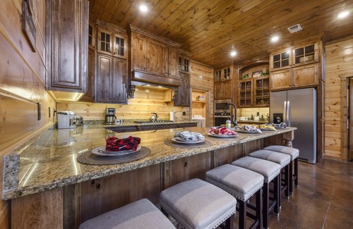 The main room of this cabin features impressive cathedral ceilings with a magnificent gas fireplace, 55” flat screen TV and plenty of comfortable seating for everyone. The deluxe kitchen is fully equipped with everything you need to prepare a gourmet meal for friends and family. Large granite island offers wonderful bar seating and plenty of space to prepare and lay out your meals for everyone in your party. As you play all day with all that Broken Bow has to offer, to peace in knowing you will coming home to your full size washer a dryer and bathrooms that each have showers and soaking tubs. A starter supply of firewood is provided for your first night of s’mores and campfire fun! The kids also have their own full bathroom upstairs.