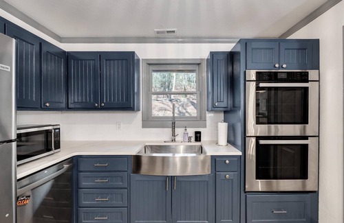Kitchen & Dining- Fully equipped kitchen to accommodate your stay. In addition to kitchen appliances, there is a Keurig and air fryer. Dining room table should be able to accommodate your whole group, but if not there are extra barstools in the kitchen.