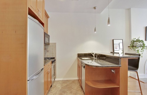 The eat-in kitchen features granite counter tops and brand new stainless steel appliances, including a microwave and dishwasher. It is also fully stocked with all the basics you will need for day-to-day living: a toaster, coffee maker, and electric water kettle.