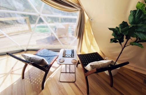 It is a glamping experience but the dome has A/C and heat, a full luxury kitchen with seating for 4, a stylish enclosed bathroom and modern decor. The full kitchen is stocked with premium cookware and dishes, custom made cabinetry, stove, fridge, dishwasher, Keurig, french press, microwave, Berkey water filter and a designer hand painted tile backsplash that was created just for the dome. The indoor bathroom includes a beautifully tiled wall in shower, sink, toilet and an enclosed washer and dryer for your use. The bed mattresses are high end with luxury sheets that will provide a great nights sleep for your adventure.