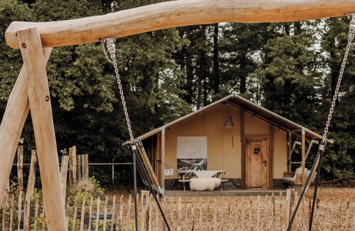 - Luxury glamping in the Veluwe: Safaritent for 6 guests with private bathroom, full kitchen, made-up beds & playground view veranda.