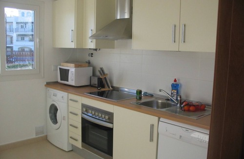 A beautiful POOLSIDE APARTMENT on the GROUND FLOOR (phase 1) with a small private garden. Two twin bedrooms provide sleeping space for four adults, and a bed settee comfortably sleeps younger members of the family. All bedding and towels are provided. Bathroom has bath and shower, washbasin, toilet and bidet.A fully fitted kitchen is provided, with oven and hob, washing machine, dishwasher, fridge freezer. Lounge area has a 40" Smart TV with UK and European cable channels and free WI FI . The lounge area opens to a tiled terrace with with patio table and chairs and a private garden with loungers which gives access to a fabulous Pool complex, with pools ranging from kiddies paddling pool (about 1 foot) / (300mm) max to a family relaxing pool (approx 5 foot), 1.5m, and a deeper, 6 foot (1.8m) pool for swimmers. The entire complex is built around an 18 hole, par 72 Golf course. 24 hour security is provided and visitors are asked to register their vehicle, on arrival.A sports area and lots of kiddies play areas ensure there are activities for all ages. The Golf clubhouse has bars and a fine restaurant, also a large supermarket caters for the family's daily needs.The local village of Sucina - 5 minute drive - is a mix of traditional Spanish and Expat residents. Many bars and restaurants cater for all needs. Bars have Sky TV and friendly local staff.