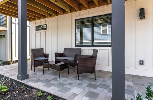 This private suite offers a separate entrance, modern furnishings, a patio for relaxation, and a fully equipped kitchenette with a coffee maker, toaster, and refrigerator, ensuring a comfortable and relaxing stay.