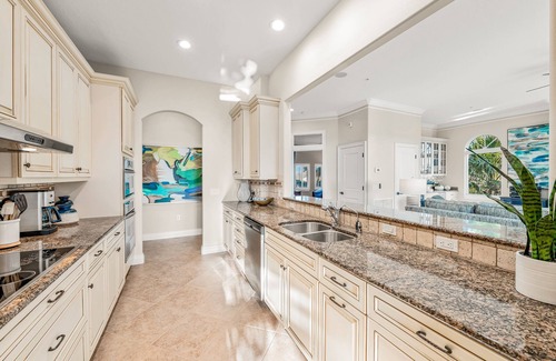 The living space has countless windows boasting water views and a lovely seating area with high-end chairs, a sofa, and a TV. The kitchen features granite countertops, bar seating for four, and a full suite of stainless-steel appliances, and in the formal dining room is a round table that seats seven guests. Prepare a concoction of delicious drinks at the wet bar and enjoy breathtaking sunsets from the private balcony.