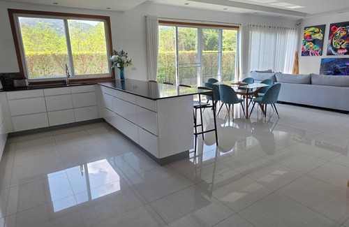 The villa boasts an open-plan kitchen, a large casual seating area with a smart TV, portable speakers, Wi-Fi, and efficient air conditioning. It's designed to be a home away from home for friends and family. The kitchen includes a utility area for storage and laundry needs.