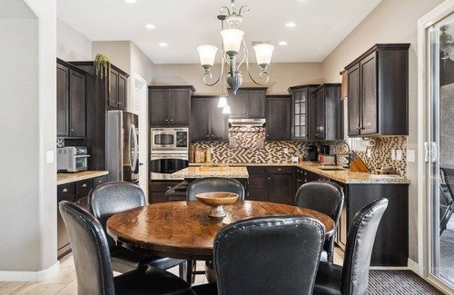 Other amenities: The large saltwater pool will keep you cool in the warmer months and can be heated in the cooler season (spa heat is included, pool heat additional $50/day fee). Relax on the patio while you barbecue on the natural gas grill or roast marshmallows over the fire pit. The backyard is spacious and completely private. There are plenty of chairs and chaises. The remote controlled misting system will cool the air by up to 20 degrees even in the hottest months.