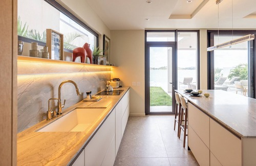 The open-plan living area flows seamlessly into a sleek, fully equipped chef’s kitchen and extends onto a generous terrace, where your private pool invites sun-drenched afternoons and moonlit swims. A private dock offers direct access to the lagoon — perfect for boating enthusiasts or simply enjoying the peaceful waterfront setting.