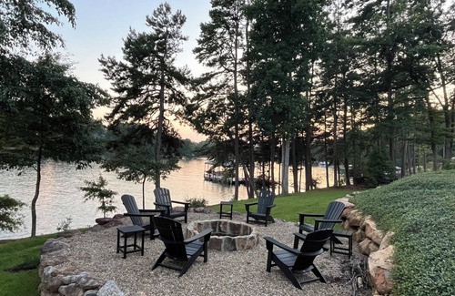 Luxury home has big lake views from every room in the house. It comfortably sleeps 12 people and has just been decorated with new furnishings throughout. There are many spaces to hang out and relax including two family rooms, two eating areas, deck overlooking the lake and large fire pit area. Lake activities include a dock with two spots to tie up boats and/or jet skis.