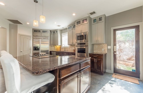 WEEKLY DISCOUNTS, BOAT RENTAL: Luxury retreat with relaxing pool! 5 bedroom, 4 bath entire Luxury estate home on 3 acres with private gate. Backyard Pool (optional to heat) & hot tub, private boat dock on Lake Travis (Pedernales river arm). Two living areas, (downstairs living w/ 60" TV, upstairs game room w/ 60" TV), pool table or ping pong. 2 covered patios (upstairs and downstairs). Full gourmet kitchen with double convection oven, convection microwave, dishwasher, and built in 48" refrigerator, plus small appliances (kitchen Aid mixer, Vitamix blender, toaster, moccamaster drip coffee maker & Keurig) . Firepit overlooking beautiful Lake Travis River. Dining seats 10, breakfast area overlooking pool seats 4-6, plus the kitchen bar area seats 4. Each bedroom has a private bath with the exception of pool bath sharing with downstairs guest room. Master & 1 guest room downstairs. Gym on upstairs open air patio. We have bedroom closets locked but each room has a wardrobe for hanging clothes + dressers. Gas grill, road to the lake (can rent golf cart or walk, it's a 100yrds downhill, just steep). Lake fun includes Paddle boards & a kayak on the dock. You may bring your own boat (22frt or less) or rent from a local marina or check our ATX Boat Charters on facebook. (I can provide information for boat rentals if needed)