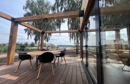 Elevate your holiday experience in this stylish lodge perched just above the beach and sparkling waters of Holiday Park Leukermeer. With floor-to-ceiling windows and a beautifully furnished, air-conditioned living area, you'll enjoy panoramic lake views from the comfort of your sofa. The open-concept layout includes a sleek kitchen with modern appliances, and two serene bedrooms—one with a plush boxspring double bed and TV, and the other with two cozy boxspring singles. Step through the garden doors onto your private terrace, where you can dine al fresco or unwind with a glass of wine while soaking in the peaceful surroundings. With access to both indoor and outdoor swimming pools, this pet-free lodge offers relaxation and recreation year-round. The car-free design of the park ensures a tranquil atmosphere for morning strolls and quiet evenings under the stars. Located in the charming village of Well, you’re just minutes away from scenic cycling routes, lakeside activities, and inviting local eateries. Don’t miss Brasserie ’t Leukermeer for a fresh meal with water views or head into nearby Venray for cozy cafés and regional specialties. Whether you're after nature, comfort, or great dining, this lodge is your ideal Limburg escape—designed for rest and rejuvenation, without pets.