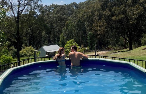 Set on a ridge with sea views, Bawley Ridge Cottage is a secluded, spacious & dog-friendly log cabin with lofty beamed ceilings, cosy living area, & luxury bathroom. A Queen size bed is the main cabin open plan area plus an additional single bed can be installed in the study / dressing room with prior request. The cabin has a well-equipped kitchen, a wood burning stove (wood provided) & fast internet, plus an outdoor bath & firepit. 10 mins from Bawley Point, with its pristine beaches, the cottage is on an 8 acre farm, with alpacas, peacocks, geese and goats you can feed, up in Termeil Forest on the South Coast of NSW. We now have a swimming pool you can use which is heaven on a hot day. We also provide transport at a competitive fare to and from nearby walking trails, wedding venues and wineries.