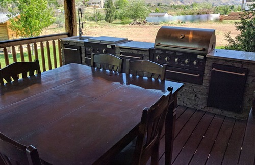 Amazing, nearly 3,000 sq. ft. Log Home Near Zion National Park. Features luxurious, yet rustic interior with plenty of space for a large group. Guests will enjoy the Covered Deck with deluxe barbecue grill and dining area. Southern Utah has beautiful weather where you can enjoy the backyard Fire Pits and beautiful large pond with waterfalls. This vacation home is located on a quiet street and has beautiful views of Southern Utah's landscapes.