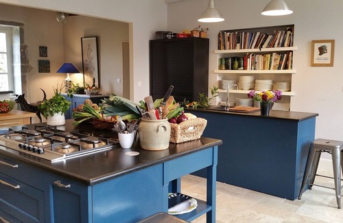 The open-plan semi-professional kitchen is in the center of household activity. Sliding metal 'atelier' doors allow the kitchen to be versatile, open or closed as needs be. Three ovens, eight burner on two tops, three refrigerators, two work islands and lots of storage make this an ideal work space for those interested in the culinary pleasures of Burgundy. An herb garden is just out the door in the courtyard. A separate bread house serves as a summer kitchen, with wood-fired oven, fridge, plancha and prep and clean-up surfaces.