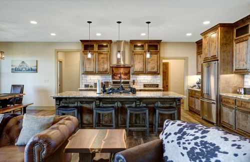 Kitchen & Dining – The fully stocked chef’s kitchen features stainless appliances and a breakfast bar with seating for four. Savor your morning coffee from the Keurig or drip coffee maker (coffee provided) before gathering at the wood dining table for eight, set against a stunning mountain backdrop.