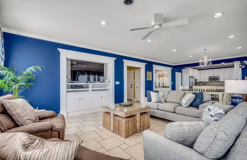 Brought to you by Luxury Beach Rentals, Oasis is a gorgeous 7 bedroom 7.5 bath oceanfront home with pool, hot tub, kiddie pool and huge covered outdoor kitchen. This house has panoramic ocean views from nearly every room. The house features three oceanfront master suites all with an oceanfront balcony, private bathrooms w/ walk-in showers and one with a separate jacuzzi tub. All bedrooms have their own attached bathrooms plus a common half bath on the main level. The house also features a gourmet kitchen with all stainless appliances including two ovens, two refrigerators and large bar top. The house has a large open upper deck off all of the oceanfront bedrooms and large main level covered deck with sitting area and uncovered area for sunbathing. All bedrooms have flat screen TVs and living room has 60inch smart tv.