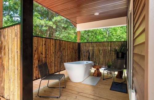 Outside you will find a second bathtub. This outdoor bathtub is private and positioned so you can enjoy a relaxing bath while listening to the relaxing sounds of nature. In addition, there is a private firepit, barbeque, and hammock. We provide one complimentary bundle of firewood for each day booked.