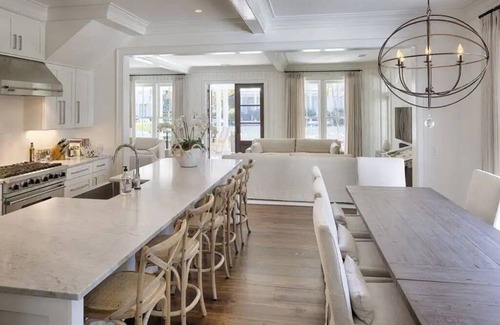 • Chef's kitchen with oversized center island (seats five), high quality appliances, and generous countertop space, flowing into a formal dining room for eight