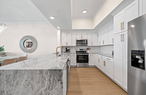Featuring a stunning waterfall countertop island, open-concept living with floor-to-ceiling glass, and three spacious bedrooms including a custom bunk room. This penthouse blends comfort and design like no other. Step onto the private 25th-floor balcony to take in breathtaking sunsets over the endless Gulf horizon.