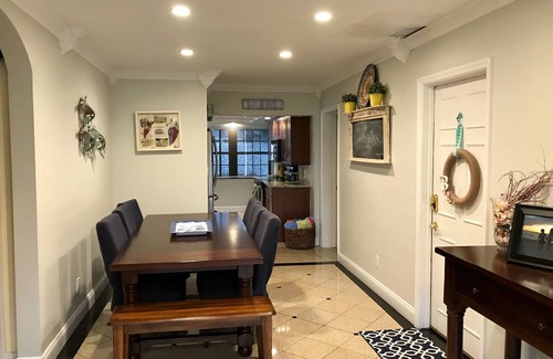 Updated Kitchen with toaster, coffee pot, crock pot, bullet blender, george foreman grill. The outdoor area includes many areas for entertaining or relaxation. Pool area has full sized table, double chaise, and lounge chair area. Perfect for cocktails during sunset. The hot tub area is a separate area adjacent to the pool. There is additional seating in that area. Situated in a residential area. Steps to the private boat dock where you can fish, kayak, or simply enjoy the intercoastal view. We have often seen dolphins and manatees from the dock.