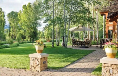 Creeks trickle past and aspen leaves flutter outside this lodge-style property spread out over 3 houses and 67 acres. Wood-paneled rooms with stone fireplaces are a cozy contrast to the rugged Tetons, viewed through floor-to-ceiling windows. Nearly 1,000 feet of riverfront and 10 miles of private trails make this your own piece of the West—all just outside Jackson.