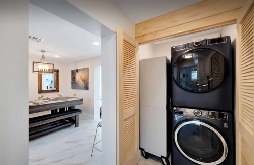 This home is approx. 1500 sq feet of central air conditioning & heated space. Features a open format kitchen-dining-living room and double sliding glass pool access with full size washer and dryer. The eat-in kitchen area has plenty of space to host and seat the entire family. Best of all is your own private home with 85 inch TV where your whole family can snuggle up on the oversized sectional sofa and enjoy the many ways to watch your favorite films. There are 2 total office work spaces, 1 located inside bedroom for privacy with desks and office chair for all your remote office needs. Every room has a smart TV, you only need to log in with your own digital subscription or streaming service on our high speed Internet.