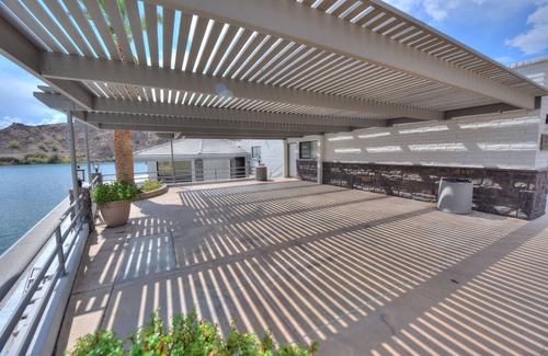 Kick back & relax in this luxury 4 bedroom 5 bathroom home located in a gated community on the riverfront. Enjoy the best views on a massive waterfront dock or watch the breathtaking Arizona sunsets on a 25ft custom cloud couch through the grand windows. This upscale getaway has 3 king rooms with private bathrooms connected, 1 room with 2 full beds, and a bathroom with a shower&bathtub across the hallway. Downstairs has a guest bathroom&shower. Feel free to message me with any questions!