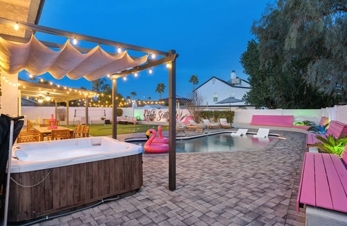 Modern Scottsdale luxury with TONS of entertainment - you'll never want to leave! This gorgeous home is laid out perfectly for entertaining your family and friends, as well as packed with games & fun! Game room, pool table, arcade games, heated pool, fire pit, mini golf, and more!