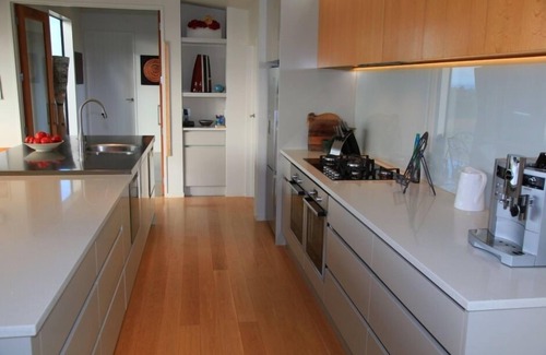 Relax in the spacious rooms with floor to ceiling glass, lounge outside in the covered deck area, take a dip in the saltwater swimming pool or hot spa. The fully equipped designer kitchen and large dining table allow large groups to cook and dine with ease. Bikes and kayaks are available to use at the house, plus double garage.