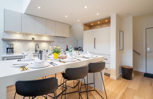 Penthouse Suite is the ultimate Whistler getaway for families or groups of friends who aren't willing to compromise on location, comfort, or amenities. The vaulted ceilings and large windows offer a bright, open space in the luxury setting of a renovated home. A fully equipped kitchen and a large island dining bar are perfect for home-cooked meals. Located across from the Fairmont, you'll be a 2-minute walk from the Blackcomb gondola and right in the heart of Upper Village, where you will find a grocery store, liquor store, ski and bike rentals, coffee, fine dining restaurants, shops, and restaurants to grab a quick lunch.