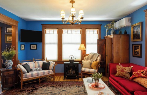 Living Room: Two Victorian couches with pillows, and two armchairs provide plenty of room to lounge. The wooden floors are covered with an antique carpet, and there are side tables (one filled with playing cards, a tarot deck, and UNO), side lamps, a chandelier, and a cozy gas log fireplace.