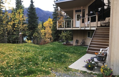 Welcome to one of the best view accommodations in Cooper Landing! You feel as if you can literally touch the mountains with magnificent Mt. Cecil Rhode towering before you! Listen to the rushing river as the eagles soar above; a true 'wilderness experience' with the comforts of home! Your 'space' is the very private entire downstairs overlooking the Kenai River & majestic mountains! There is a separate entrance and you may never even know anybody else is around even though we live here as well. We'd love to meet you or, if you want to indulge in the serenity of the Kenai, we respect that. The full, newly remodeled kitchen is very well appointed with full size fridge, microwave, coffee pot and french vanilla creamer. The essentials are provided such as oil, salt and pepper and a welcome basket of fresh fruit, homemade muffins, oatmeal packs in addition to homemade Greek yogurt & berries parfait and fresh hard boiled eggs greet you! There's a private deck overlooking the river to lounge, bar b que grill and fire pit right outside your door for the option of enjoying the outdoors a little more. A small library stocked with Alaskana books for pleasurable reading is available, but we also have DirecTV and free wifi. You might find our huskies more entertaining! The host huskies usually greet you and will keep you company if you desire; they are all as happy to host you as we are! The king size bed has gotten rave reviews and the queen and futon are wonderfully comfortable as well. The bathroom is why we term this 'luxury'; with it's hammered copper sink and full glass, rain-shower water stream, it has been awarded 5 stars by our guests! Come experience "Kahtnu Spirit" to understand what the Dena'ina felt in this sacred land, after all, "Kahtnu" means 'Kenai' in the native language!