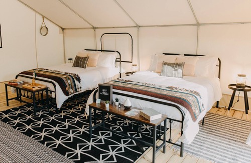 Your luxury glampsite will allow you to enjoy camping without leaving all amenities at home. It includes 2 comfortable queen beds, a Keurig Coffee maker, mini fridge, outlets for your devices, and a personal A/C & heating unit. Also provided at your site will be a fire pit, string lights, camp chairs, picnic table, and clean campground bathrooms with hot showers. You'll have your very own front and back "porch" with chairs to relax and unwind.