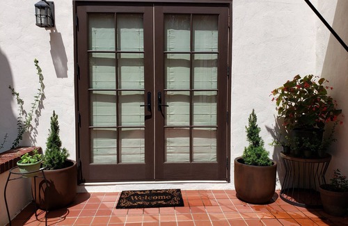 Gorgeous private suite in Mediterranean Villa with high ceilings, French doors to tile patio, floor to ceiling bookshelves, and hardwood floors. Huge spa shower with glass lined walls and stone floors. View of formal garden. Plush queen size bed, Matching Four Seasons robes provided with hotel quality linens.