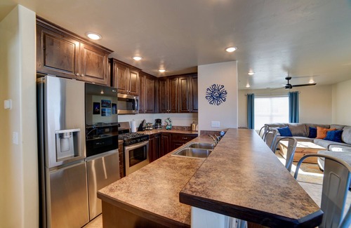 A spacious kitchen and living area offers space for your group to stretch out and relax, mingling in the comfort of a tastefully furnished and decorated home environment, or taking in the views of Moab’s South red rock cliffs from the private patio with outdoor dining and a gas grill.