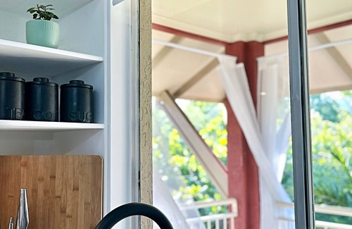 The apartment features open-plan living with a tropical twist. We have a 60” wall mounted TV and a large comfortable sofa to watch it on. The two well appointed bedrooms both have smart TV’s with Netflix, KING beds and relaxing treetop views.