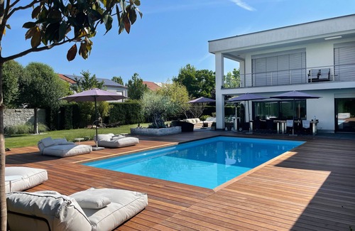 Luxury villa near Heidelberg with pool, cinema and 1300 sqm plot is located in Walldorf. Luxury villa near Heidelberg with pool, cinema and 1300 sqm plot provides accommodation, featuring Bedding/Linens, Wellness Facilities, Fireplace/Heating, among other amenities. This Villa features Bedding/Linens, Wellness Facilities, Fireplace/Heating, to make your stay a comfortable one.