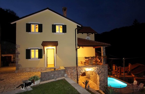 This lovely villa is situated in the town of Lovranska Draga, in the Ucka Natural Park, between the mountains and the sea, in the famous Opatija Riviera. In town, there's an inn some 200 m away and a restaurant at 500 m. You can enjoy the private pool with its six reclining chairs, right next to the garden. There is a dining area on the terrace from which you can wonder at the views of the mountains, the sea, and the sun. The indoor areas include a large, well-lit, open-plan living room. The three double bedrooms all have their own satellite TV and an en-suite bathroom. There are three private car parking areas. You can use the grill in the garden.