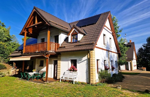 Located 2 km from the town Turnov. The house is a part of the complex of 3 houses and a swimming pool shared with the owner (in duty from April till mid of October). Two houses are rented for holiday stays. You can rent both of them if you are a big group of friends or a big family, please check the other property on the HomeAway No. 10756331 It has its own driveway and very private surroundings. The property is one hour drive from Prague, highway R10. 30 min. ride from Liberec (aquapark Babylon, ZOO, Jested, great skiing conditions, one of the best golf courses in CR - Ypsilon golf club Liberec). You can visit many ancient castles in near surroundings like Valdštejn castle founded 1260, Hrubá skála, Trosky, Rotštejn, Zbirohy, Hrubý Rohozec, Sychrov, and many others. Excellent conditions for cycling and hiking also good for motorcycling. Many beautiful nature views. Swimming in many nature ponds, or Jizera river, good conditions for canoeing. Nearest swimming pool in Kacanovy 2km. Unlimited parking place on the plot. Shuttle from Prague airport takes 1 hour, which costs 95 Euro. return 168 Euro. Best way is to borrow a car directly at the airport, as there are plenty of very interesting trips that can be made from the property.