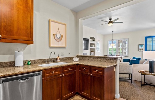 This condo has been tastefully decorated to feel both elegant and homey, making it easy for families to settle in and feel relaxed right away. Essentials like high-speed WiFi, in-unit washer and dryer, and ample closet space make your stay worry-free. We've stocked the condo with extras like games, books, and pool toys to help keep the little ones entertained. When you stay at Legacy Villas, you're stepping into a resort-style community designed with families and vacationers in mind. You’ll have access to multiple swimming pools including family pools and lap pools, hot tubs scattered throughout the property, a children’s splash play area, a fitness center with cardio and strength equipment, a clubhouse with a café (open seasonally), a hammock garden perfect for lounging, beautiful walking paths lined with palm trees and mountain views, BBQ areas and cabanas for outdoor dining, and outdoor fireplaces to gather around during cool desert nights. The lush landscaping, sparkling fountains, and Santa Rosa mountain views create a peaceful, family-friendly resort atmosphere that guests of all ages adore.